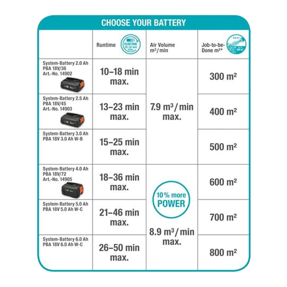 De PowerJet 18V P4A kant-en-klare set van GARDENA is een accu-aangedreven bladblazer waarmee u de tuin flexibel, snel en effectief kunt opruimen. Dit veelzijdige product is ideaal voor gebruik in de tuin en rondom het huis.De bladblazer maakt niet alleen indruk met zijn slimme en functionele ontwerp, maar vooral met zijn opmerkelijk krachtige blaasprestaties. Of het nu gaat om bladeren, kleinere takken of gemaaid gras, de PowerJet blaast ze snel, krachtig en efficiënt weg. Dankzij het innovatieve ontwerp en het hoge luchtdebiet ziet uw tuin er in een mum van tijd verzorgd en opgeruimd uit. De blazer maakt indruk met een maximaal luchtvolume van 7,9 kubieke meter per minuut voor geweldige blaasprestaties en stelt u in staat een gebied tot 400 vierkante meter schoon te maken.Afhankelijk van gebruik en tuintoepassing kan het toerental van de bladblazer individueel worden aangepast. Dankzij het lage gewicht is het werken met de bladblazer uiterst comfortabel en gemakkelijk, zelfs over de volledige maximale looptijd van 13 tot 23 minuten, afhankelijk van het ingestelde vermogen. De blazer is ook zo goed uitgebalanceerd dat er geen vermoeidheid is in de polsen en armen. Dit wordt nog versterkt door de uitstekende ergonomie van het product. Een duidelijk zichtbare LED-display op het apparaat toont het huidige laadniveau van de accu.Deze set biedt u nog meer: de set bevat ook nog een extra, bevestigbaar precisiemondstuk. Dit mondstuk vergroot het bereik van de bladblazer, waardoor u nog preciezer kunt werken in die lastig te bereiken hoeken in uw tuin en biedt meer flexibiliteit bij het aanbrengen. De krachtige, compacte en handige GARDENA accu-bladblazer is daarom ideaal voor een breed scala aan schoonmaakklussen.De Accubladblazer PowerJet 18V P4A solo wordt geleverd zonder accu en oplader. Hij is compatibel met alle 18V-accu’s van de POWER FOR ALL ALLIANCE, een van de grootste merkoverschrijdende accu-allianties van toonaangevende fabrikanten. Deze accu’s kunnen worden gebruikt voor tal van apparaten in huis en tuin. U bespaart dus geld en blijft flexibel! Koop je het product liever met het accusysteem? Geen probleem – dan is de gebruiksklare set de juiste keuze voor u. Passie aangedreven door GARDENA – Tuingereedschap op accu dat u de vrijheid geeft om te creëren.