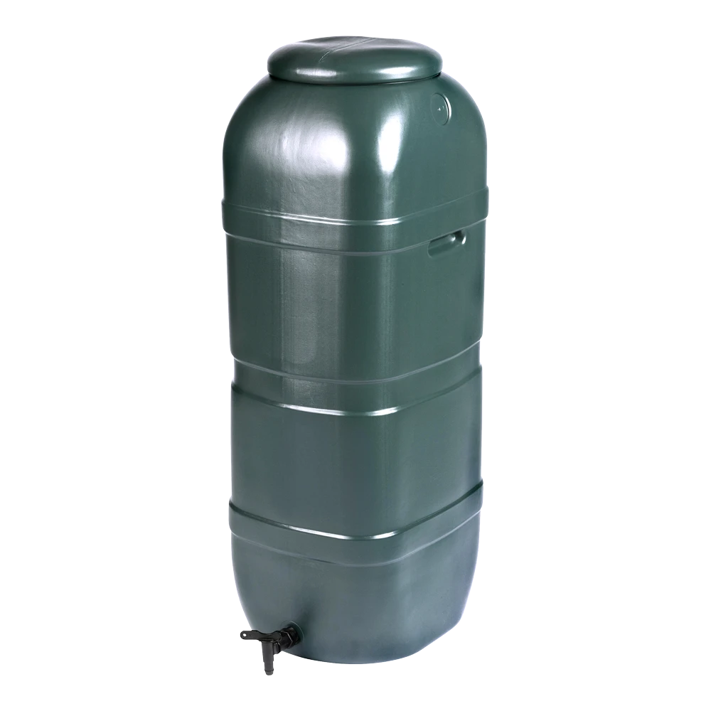 Kunststof regenton 100 L muurmodel (‘slimline’). Deze regenton is gemaakt van uv-bestendig, groen polyethyleen en heeft een kraan om makkelijk emmers en gieters te kunnen vullen. Afmeting: H 95 cm x 36 x 32 cm, inhoud: 100 L.