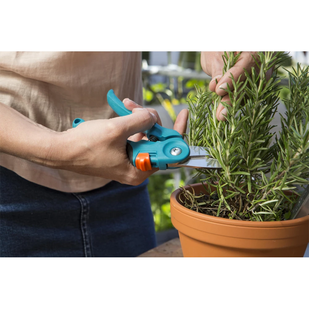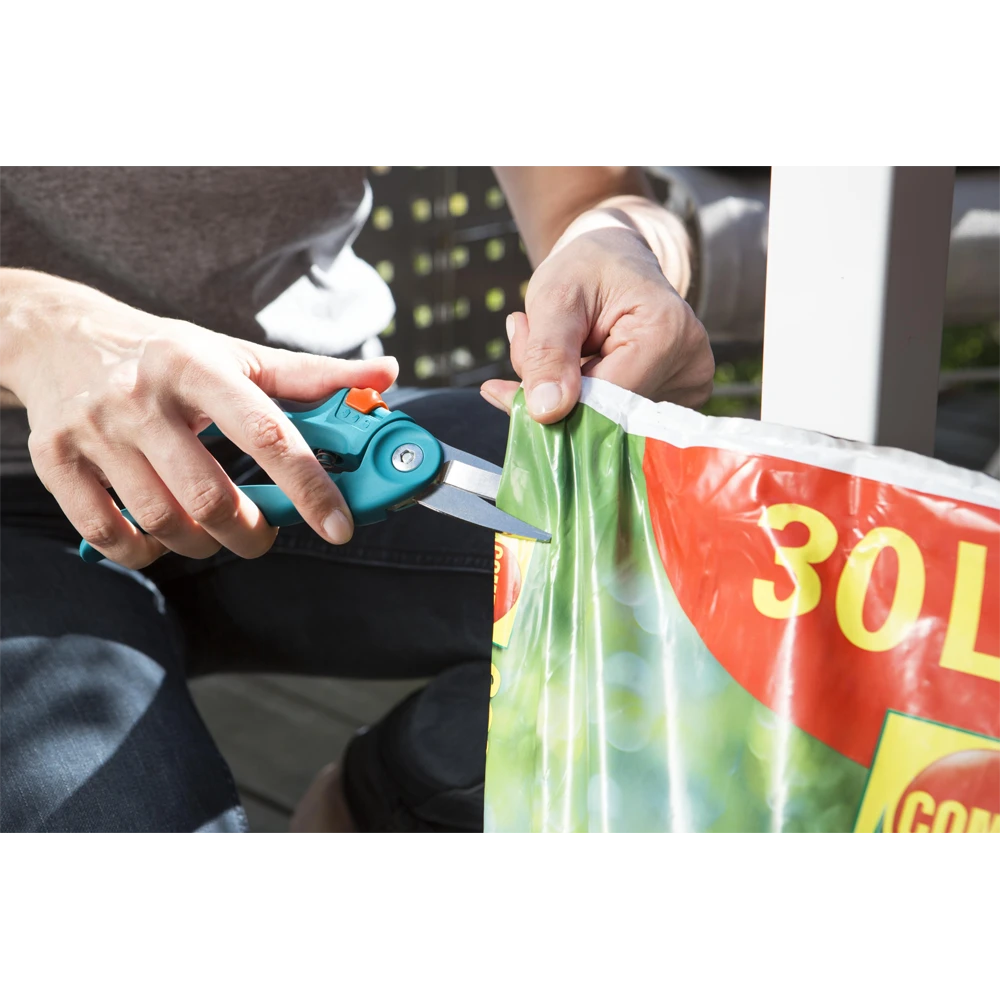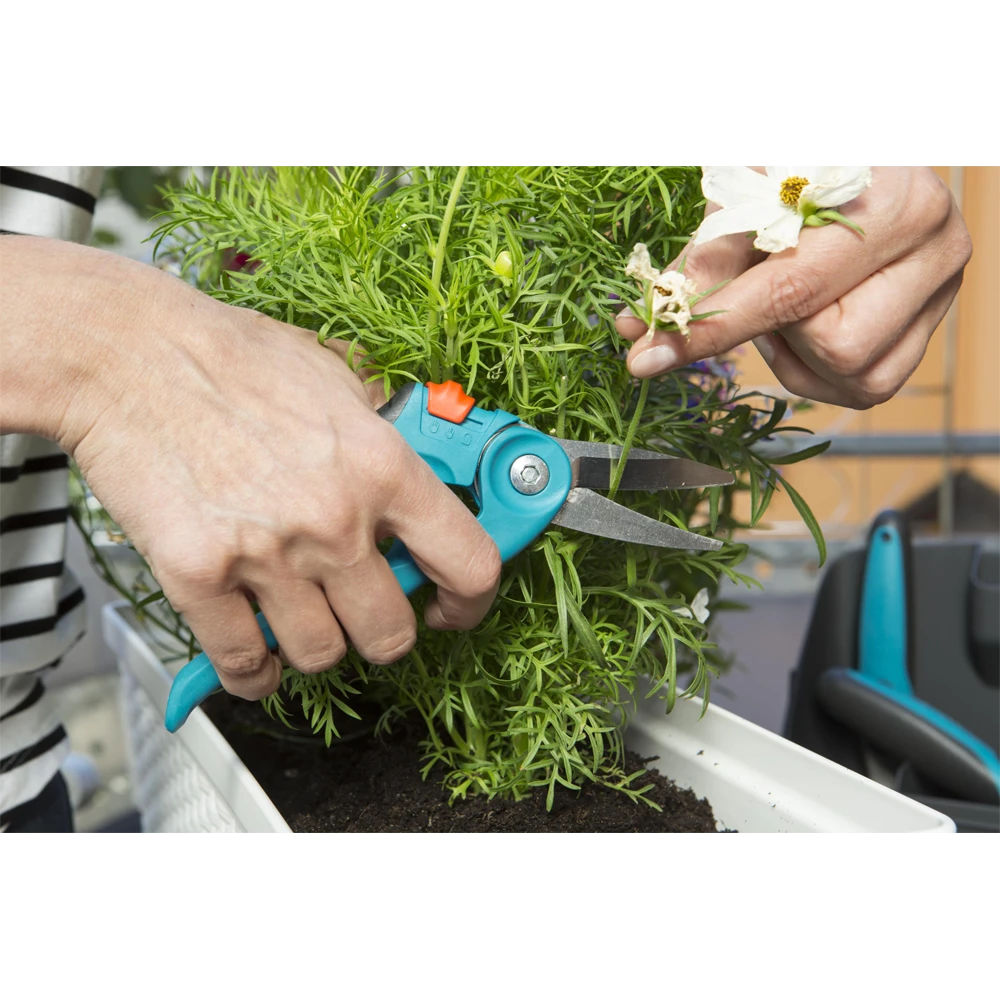 De GARDENA Balkon Snoeischaar is ideaal voor het gebruik op balkons en terrassen. De snoeischaar is perfect voor het snoeien van bloemen, kruiden, dunne takken en nog veel meer. De bladen zijn gemaakt van hoogwaardig roestvrijstaal. De scharen hebben twee verstelbare handgreepposities en een veiligheidsslot.