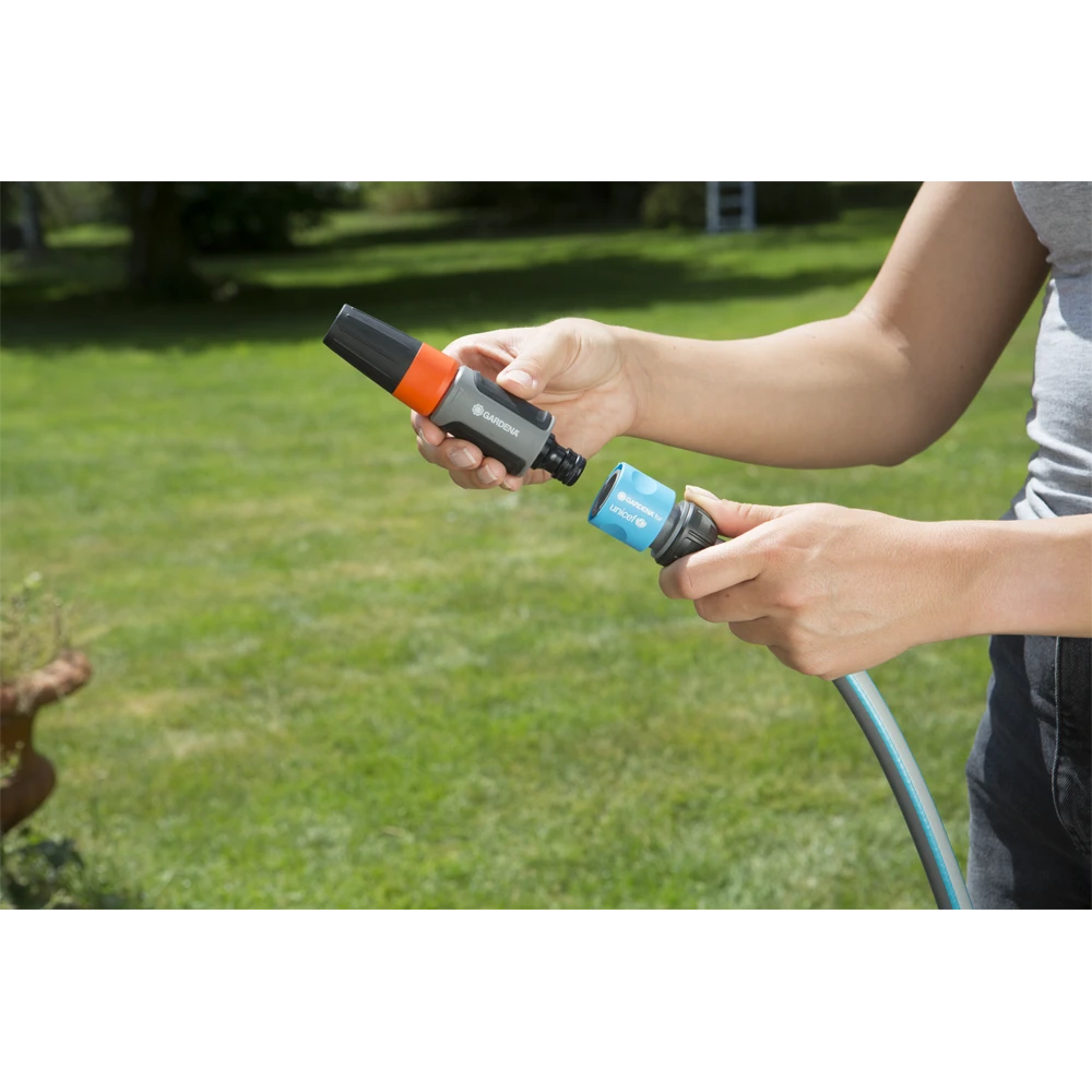 De GARDENA basisset bevat een kraanstuk met adapter (art.nr. 18202 en 5305), een slangstuk (art.nr. 18215), een aquastop (art.nr. 18213) en een Classic tuinspuit (art.nr. 18300).