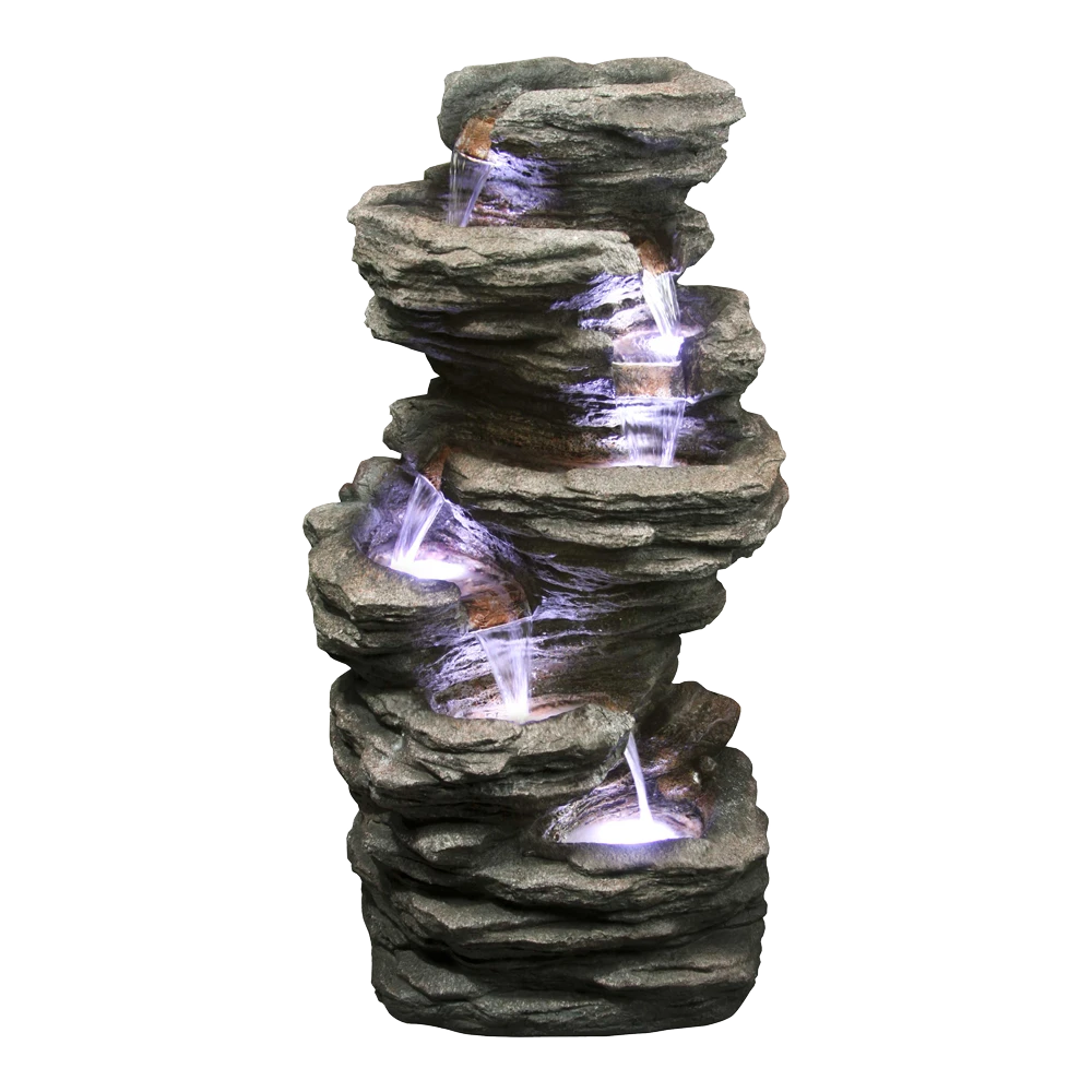 Op zoek naar een mooi waterornament voor in de tuin of op het balkon? Kies dan voor deze Waterval Kachenjunga van 81cm hoog. Dit waterornament is met zijn LED verlichting, de 6 watervallen en zijn natuurlijke design een echte eye-catcher. Hij is gemaakt van polystone, hard kunststof en is grijsbruin van kleur. Het grote voordeel van polystone is dat het precies op natuurlijke rotsen lijkt, maar licht van gewicht en weerbestendig is. Daarnaast zorgen de 6 LED lampjes voor een zeer sfeervol geheel in de avonduren.